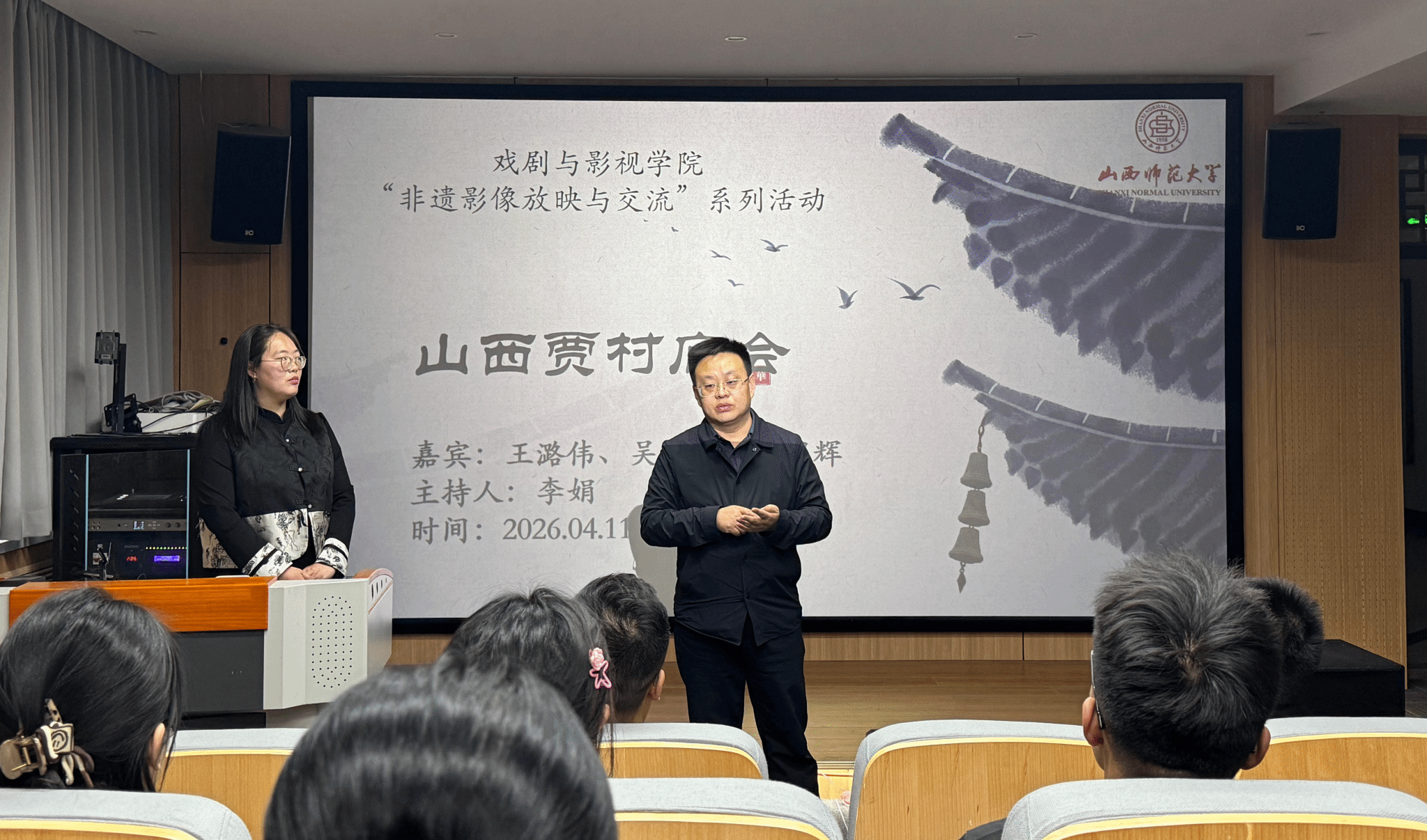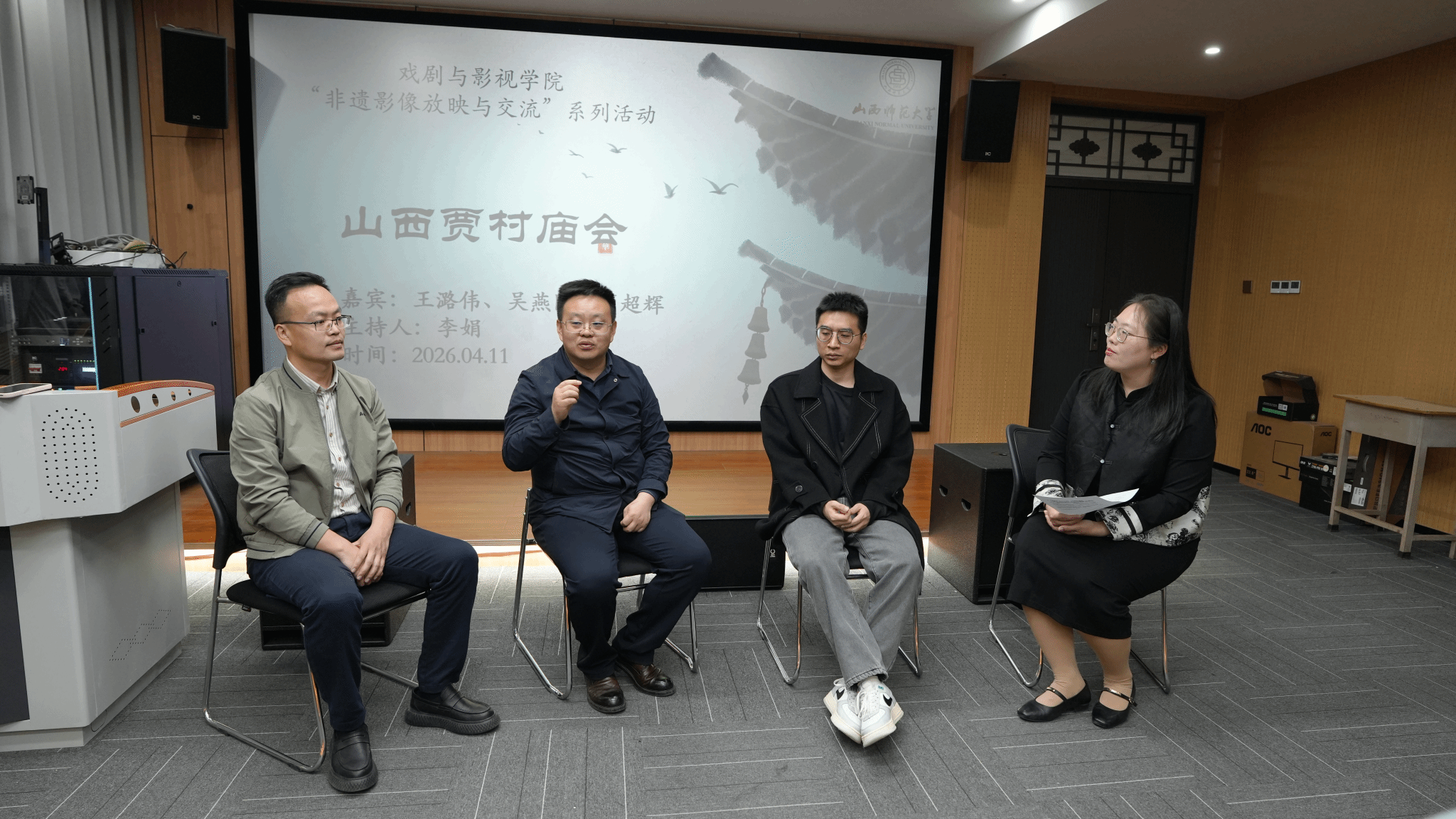 在301视听室举办了“非遗影像放映与交流”系列活动的第一期——《山西贾村庙会》专题放映活动。本次活动由李娟老师主持,特邀王潞伟、吴燕国、简超辉三位嘉宾到场,吸引了众多师生参与,共同欣赏非遗影像,沉浸式感受民俗文化的独特魅力。